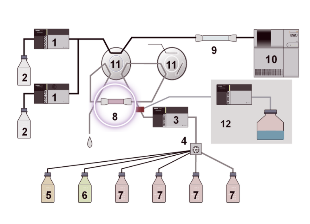 The sample solution is introduced by a pump, and BPA is concentrated on the pretreatment column (8, SPM column). After valve switching, the concentrated BPA is transferred to the analytical column, where it is separated and detected.